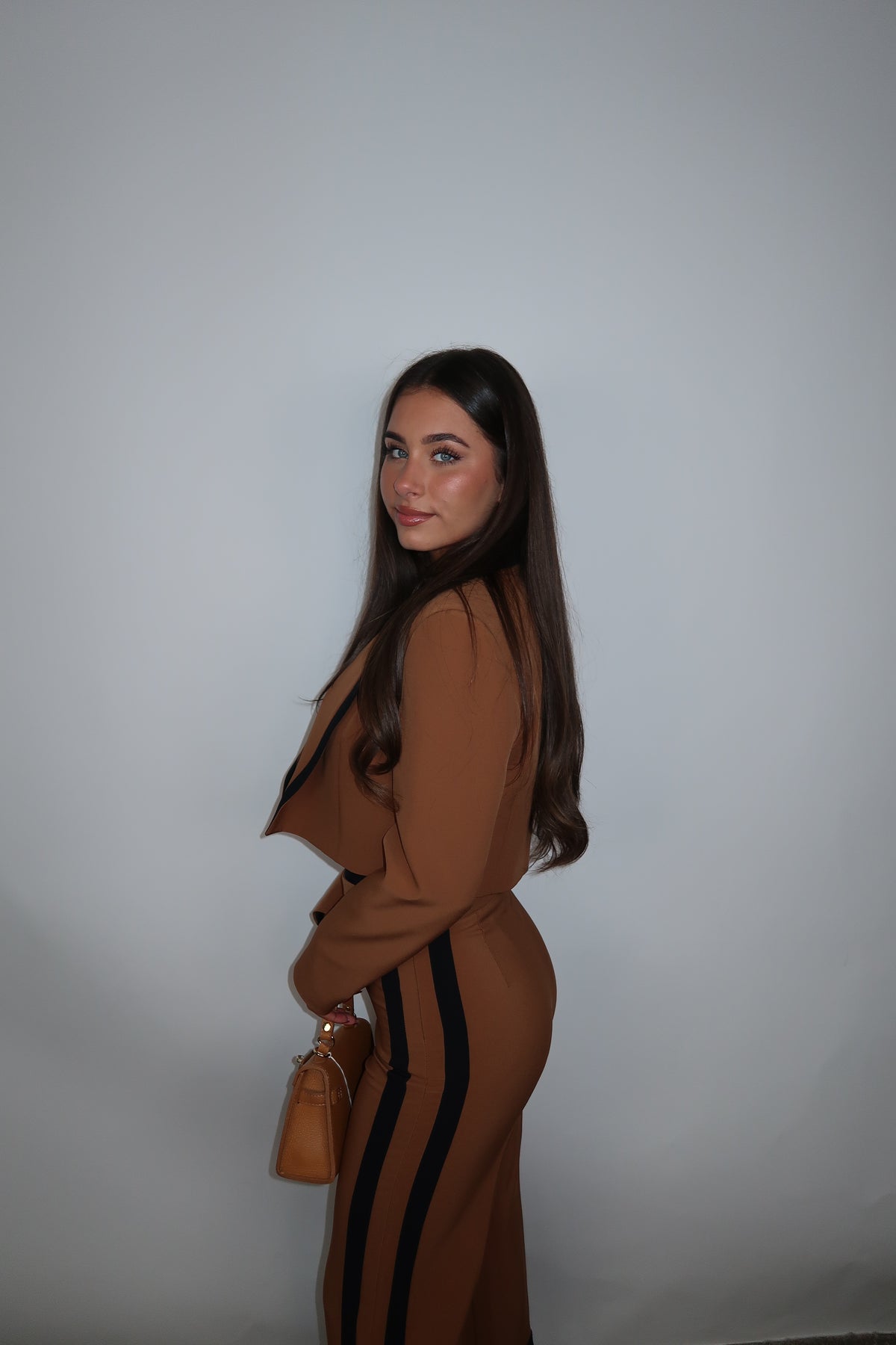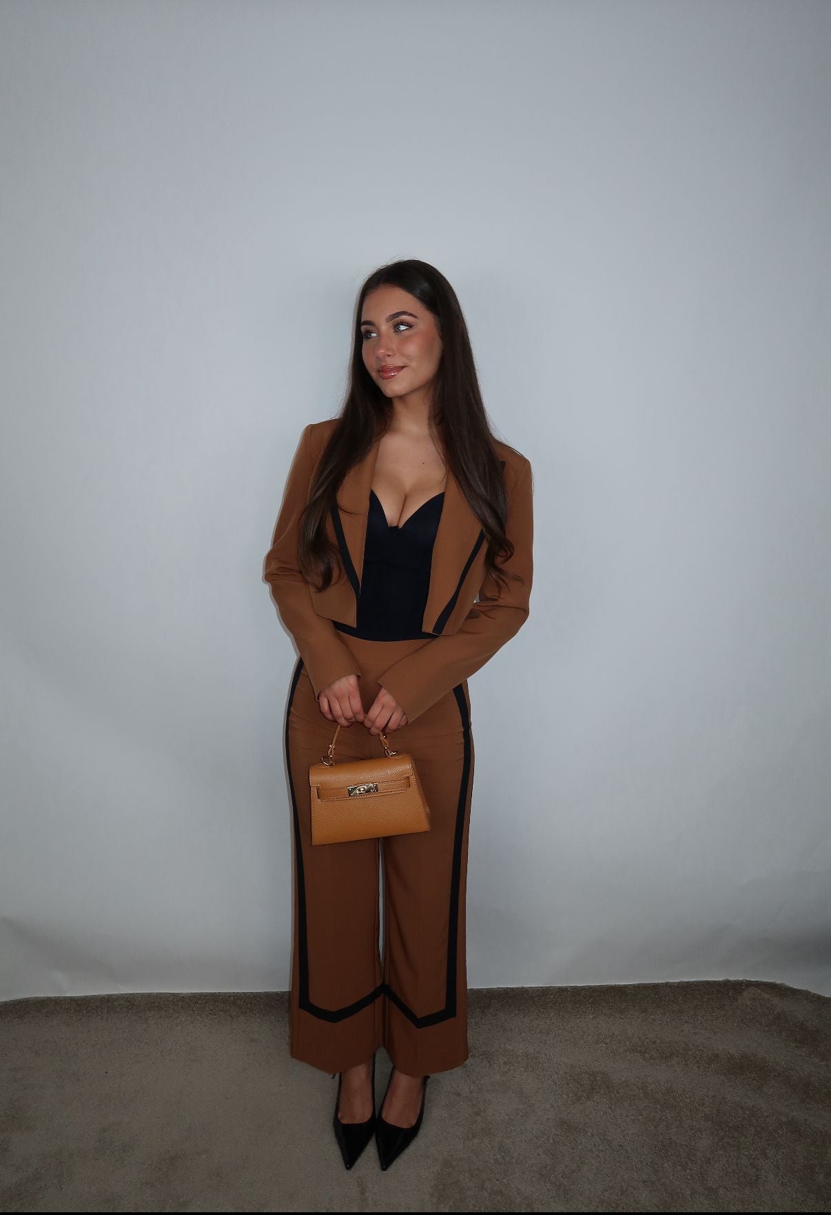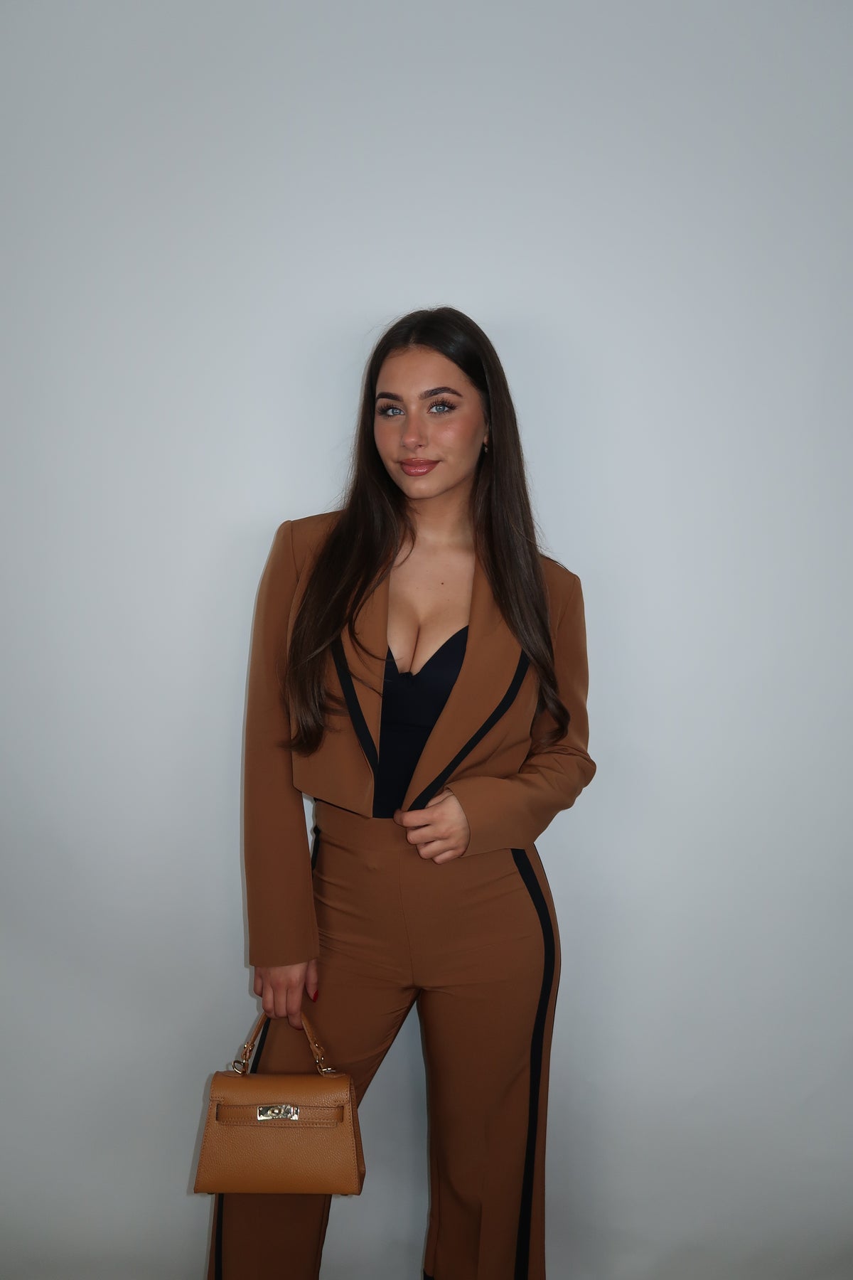 Artigli Cropped Blazer Camel met Zwarte Bies. Mooi te combineren met matching pantalon.