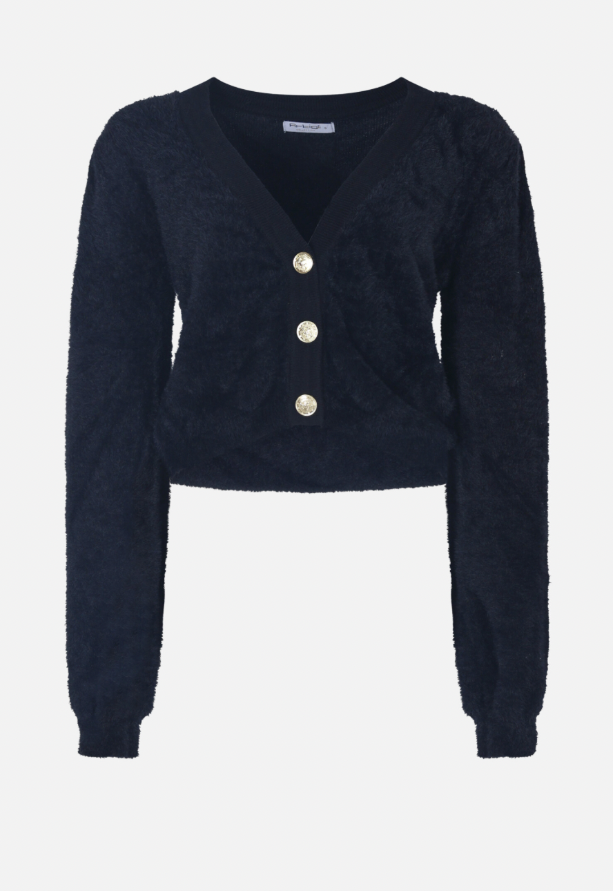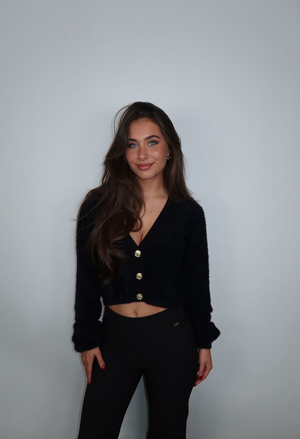 Artigli Furry Vestje in Zwart met goudkleurige knoopjes.