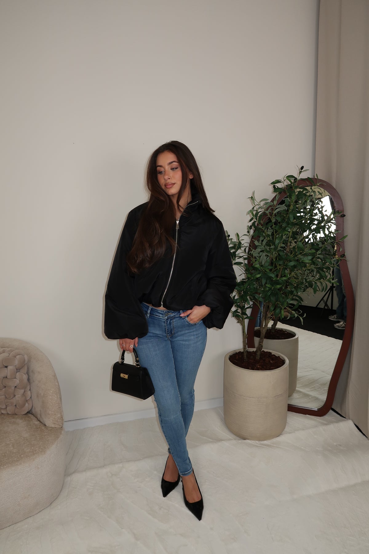 Beige Oversized Bomber in Zwart, mooie zachte stof, gevoerd met ritssluiting.One size te drage tm maat 40