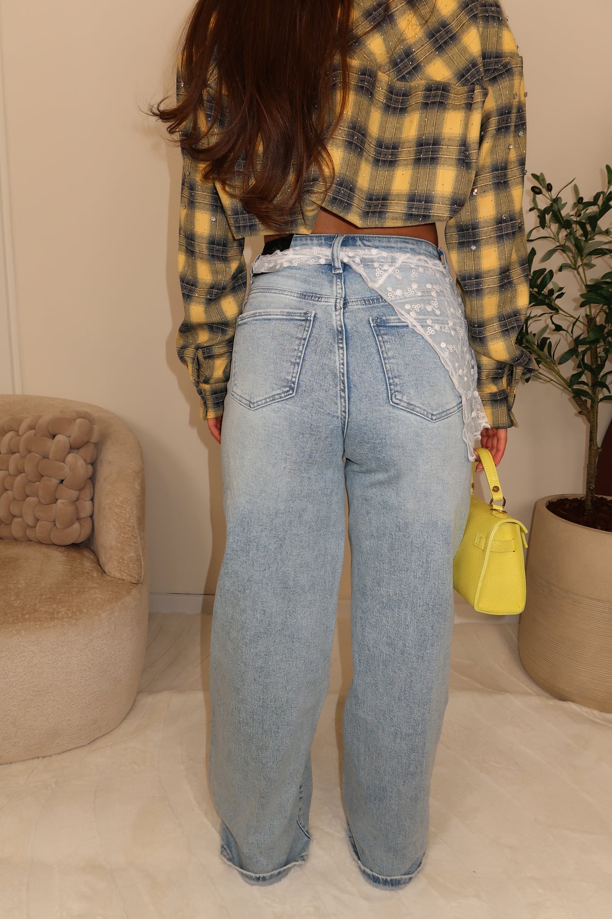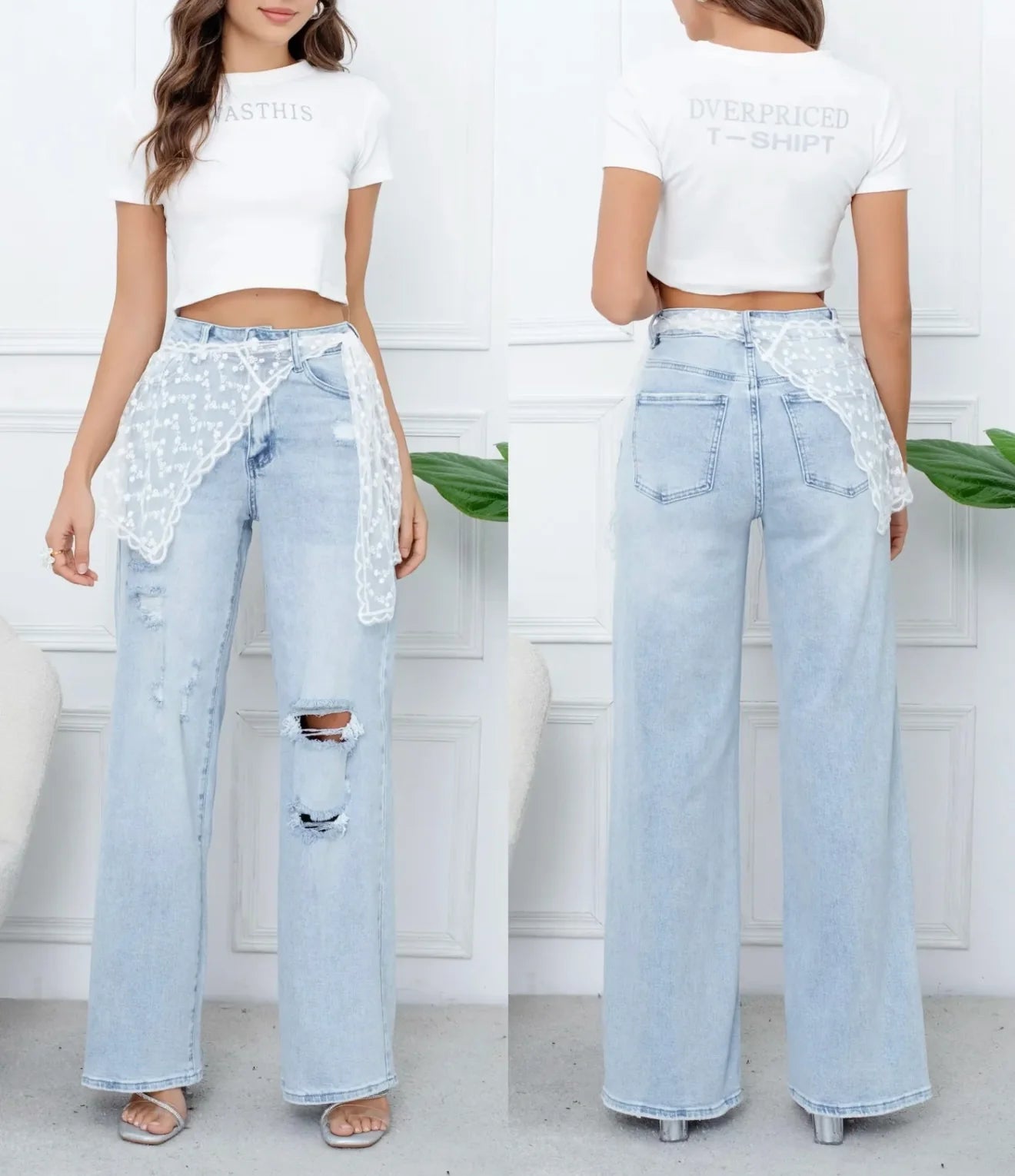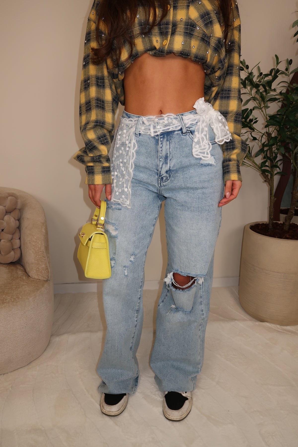 Lace Details Straight Leg Jeans Polly met scheuren, kanten sjaaltje kan eraf.