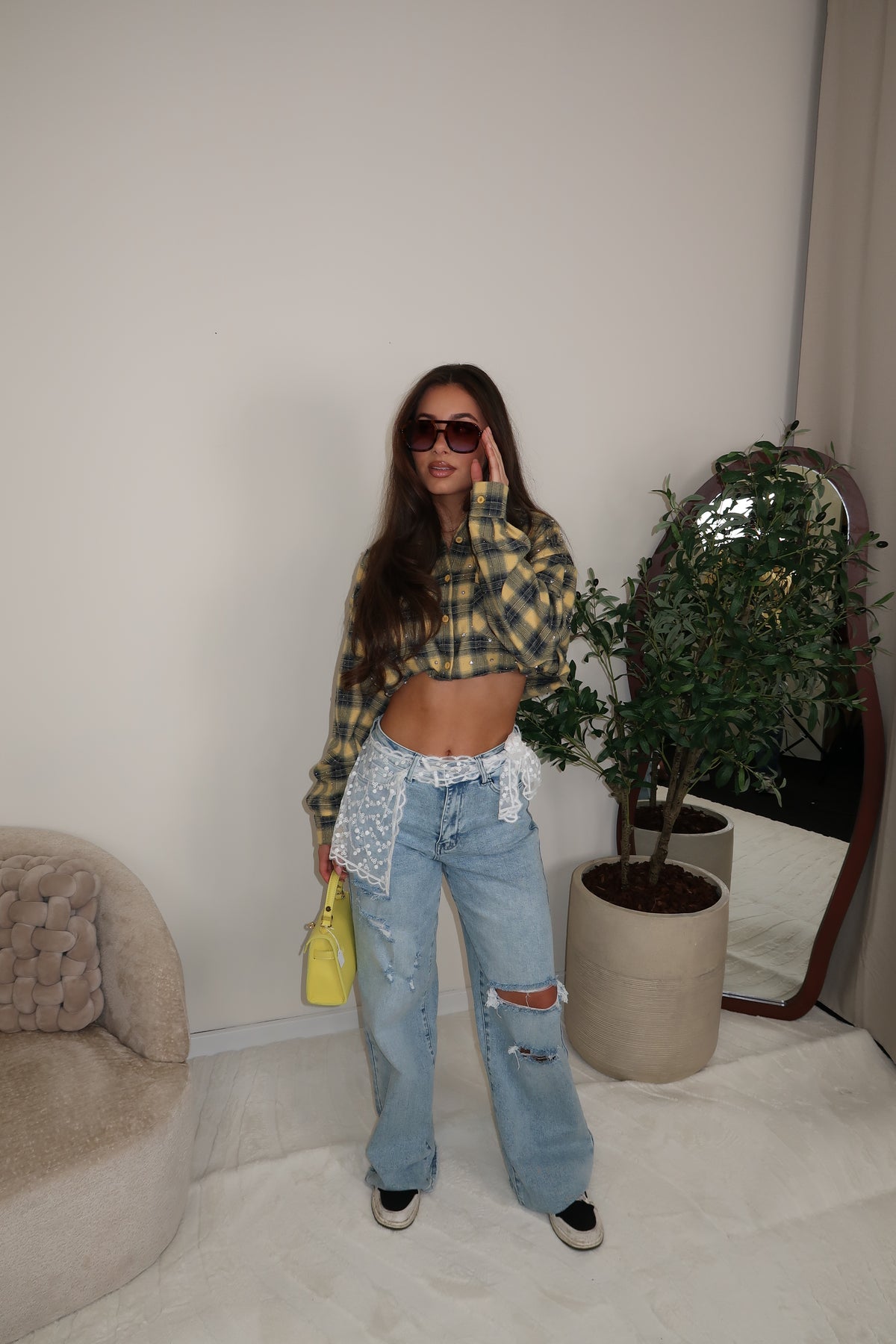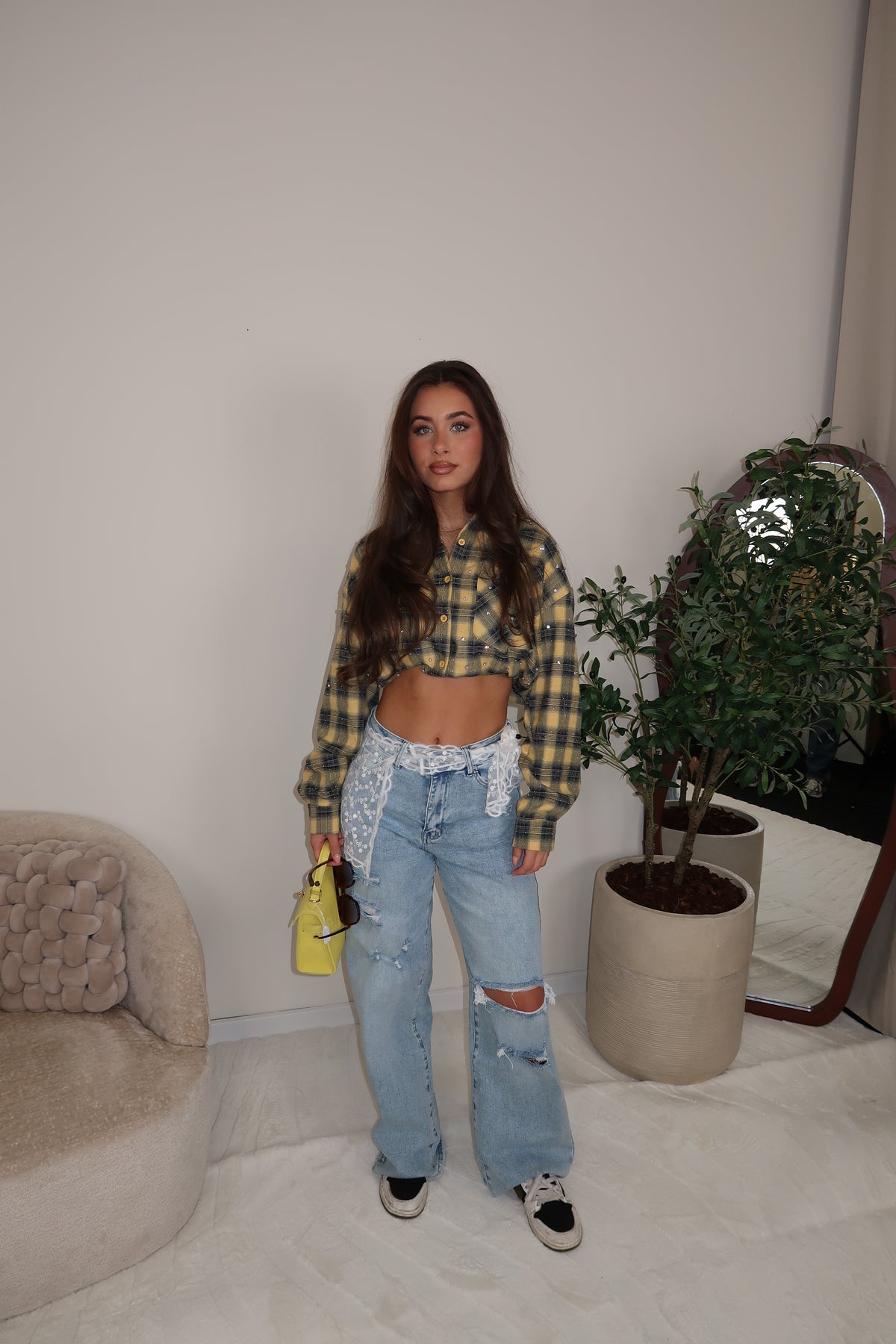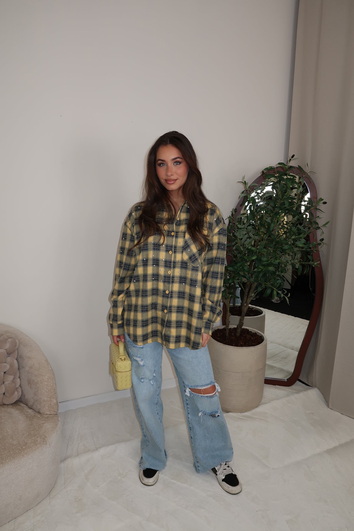 Ruitenblouse met Steentjes in Geel & Blauw , blouse is One Size en kan gedragen worden tm maat 42.