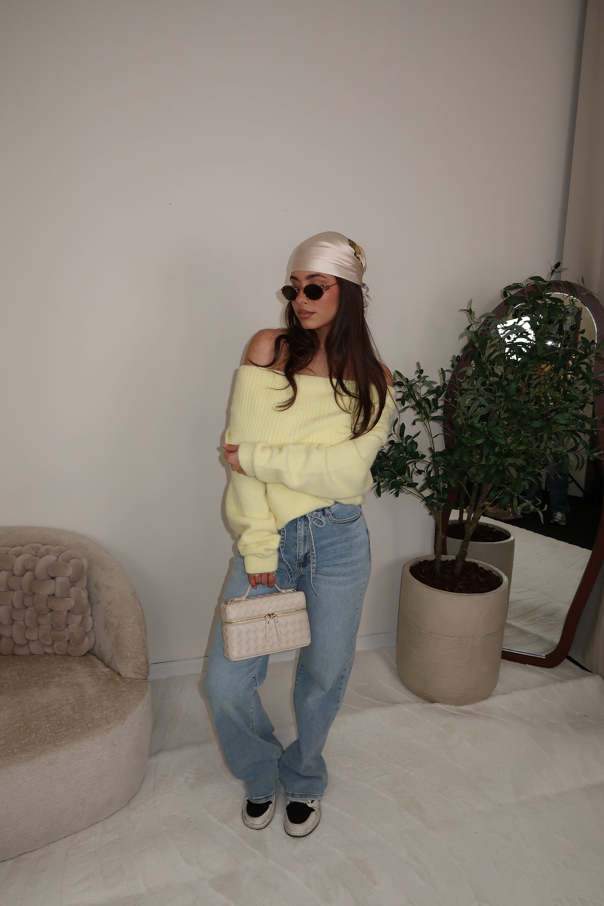 Yellow Off-Shoulder Knitted Sweater, trui is One Size en kan gedragen worden tm maat 40.