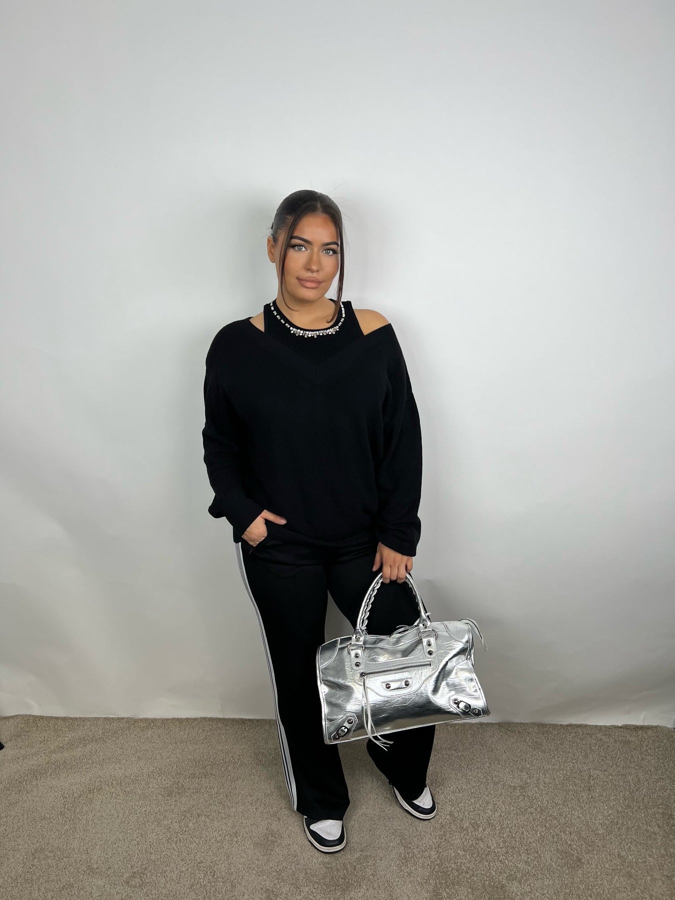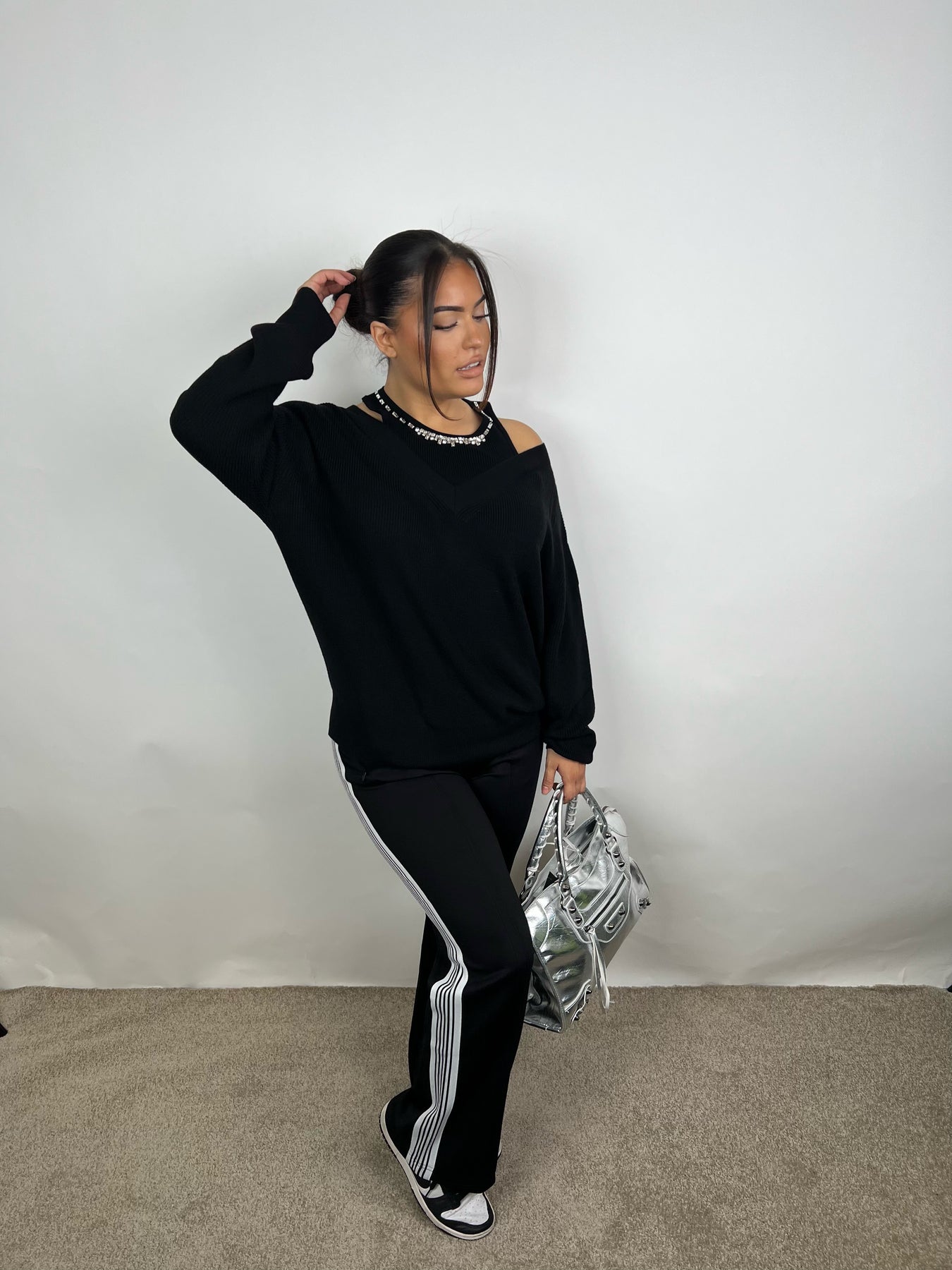 Ambika Straight Leg Jogger Zwart met witte strepen aan de zijkant, elastische tailleband en steekzakken met ritssluitingen.
