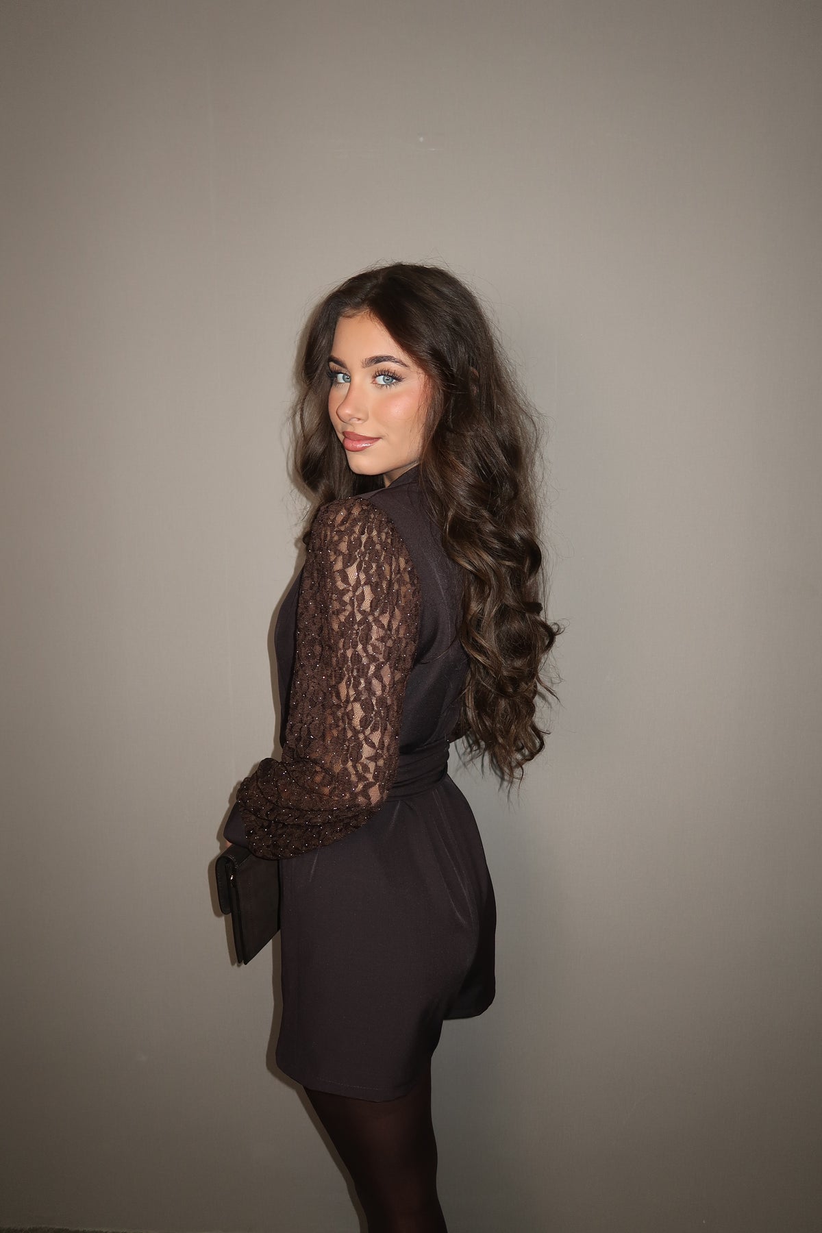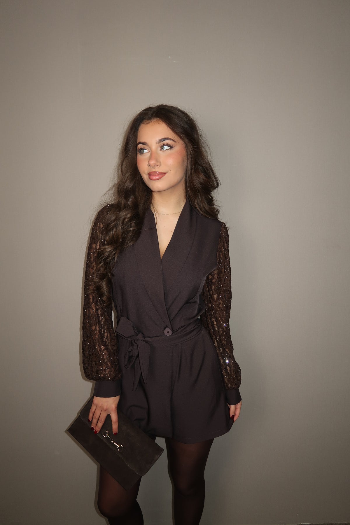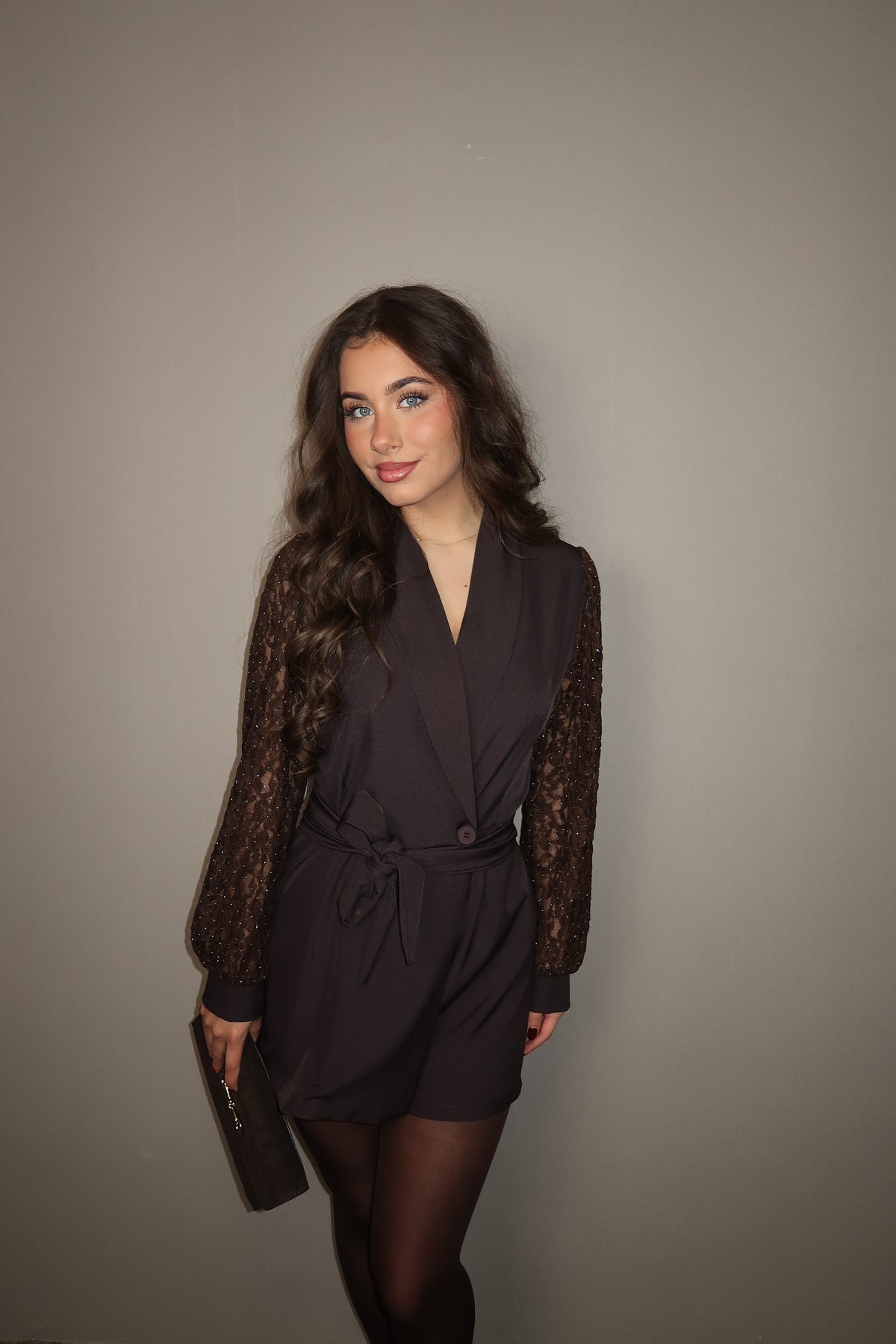 Brown Lace Sleeves Playsuit met stoffen ceintuur en kanten mouwen met steentjes. One size te dragen tm maat 40