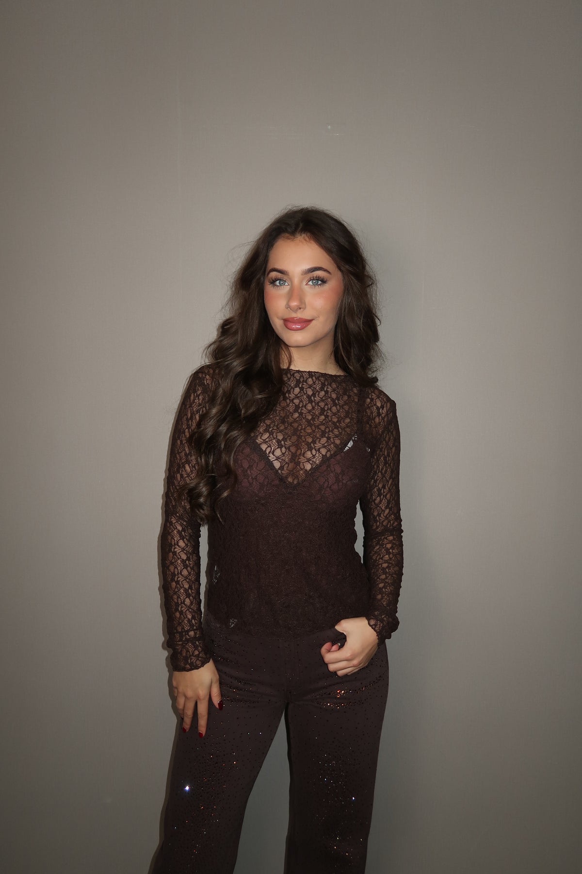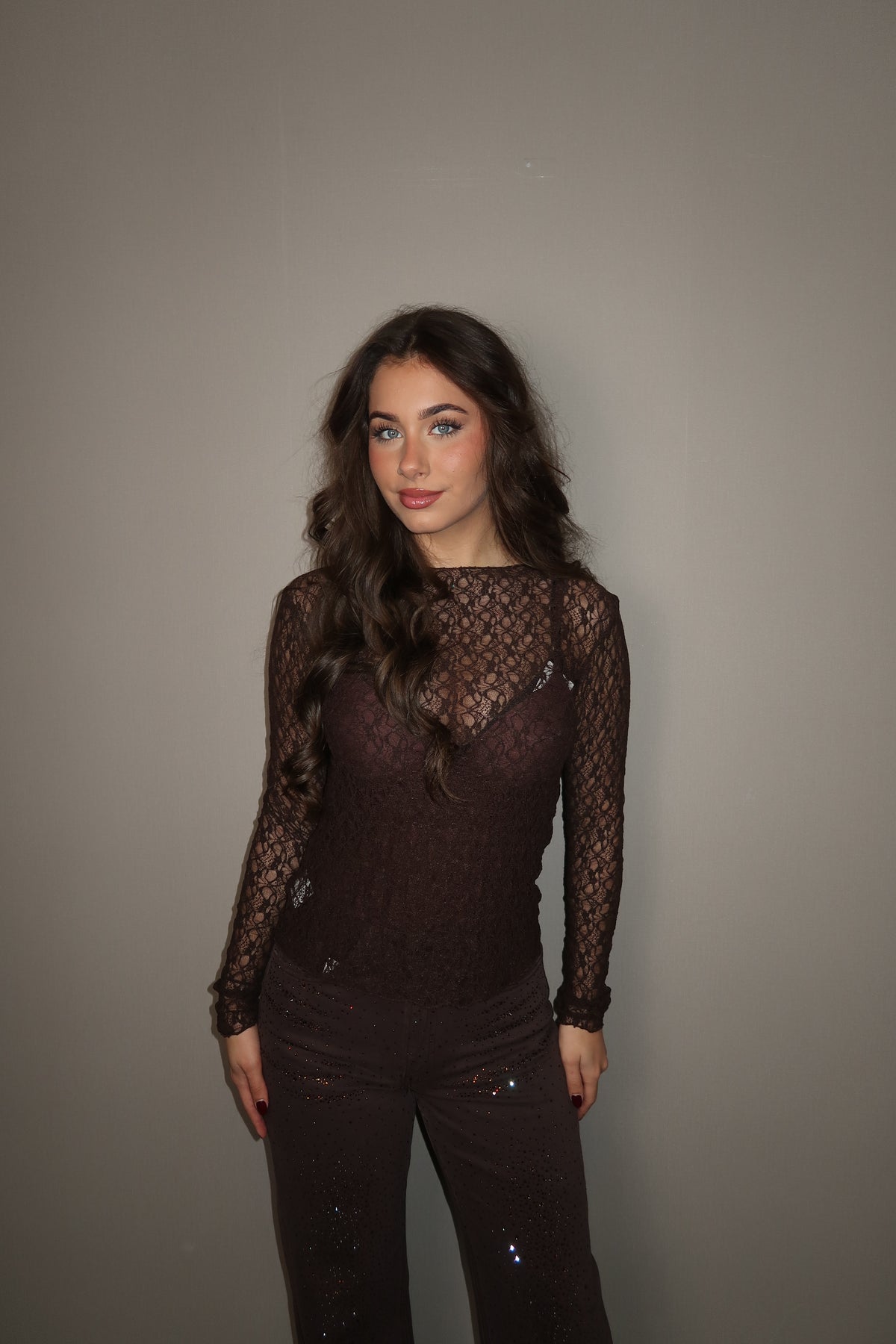 Bruine Kanten Stretch Top in zachte stof met lange mouwen.