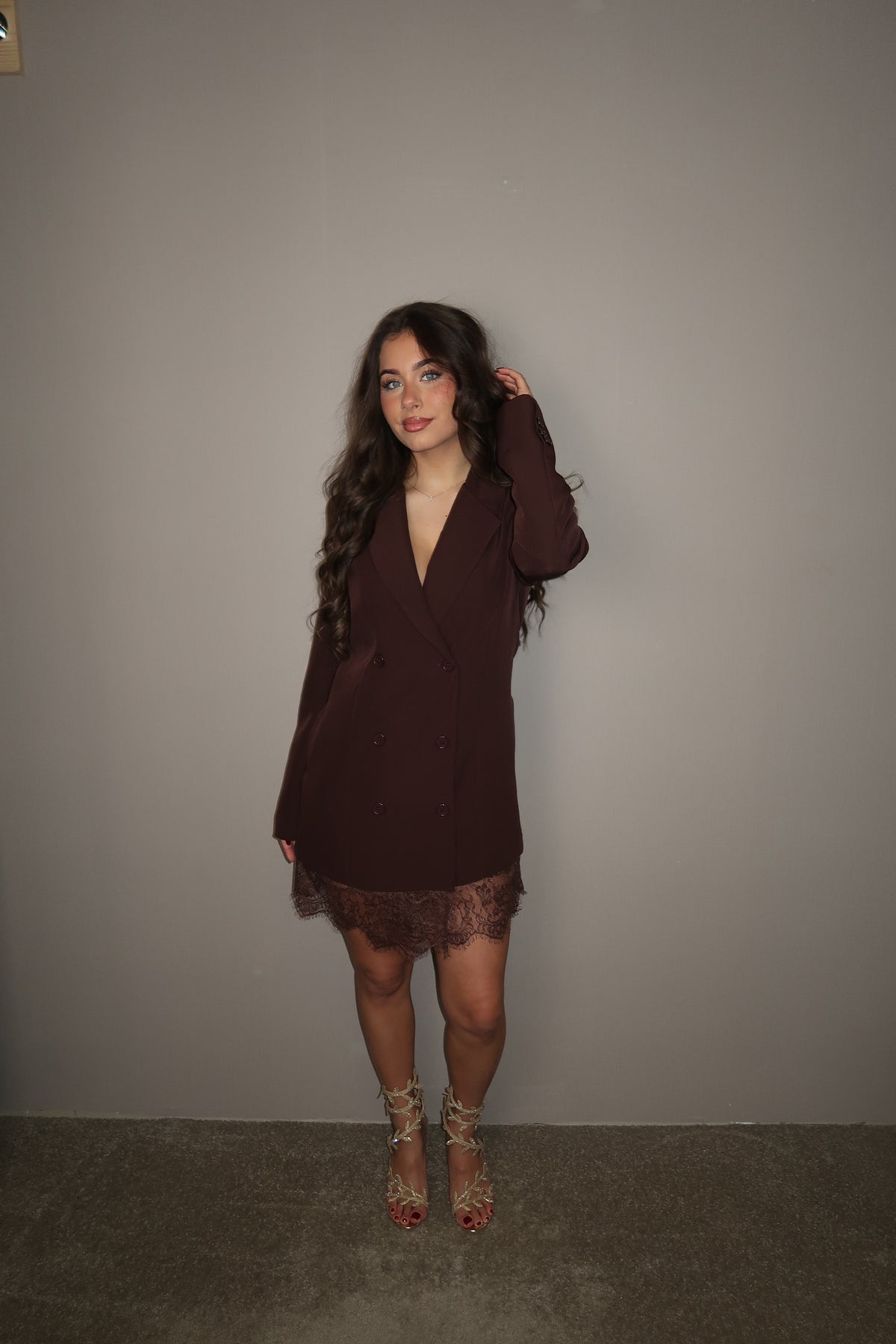 Dark Brown Blazerdress met kanten bies aan de onderkant.