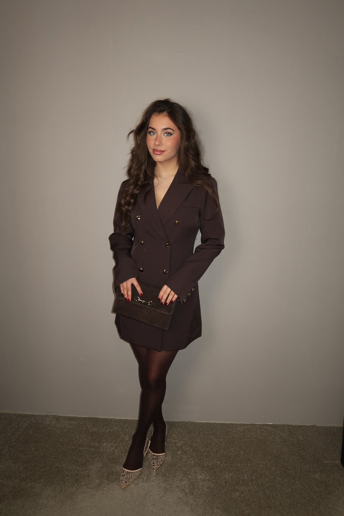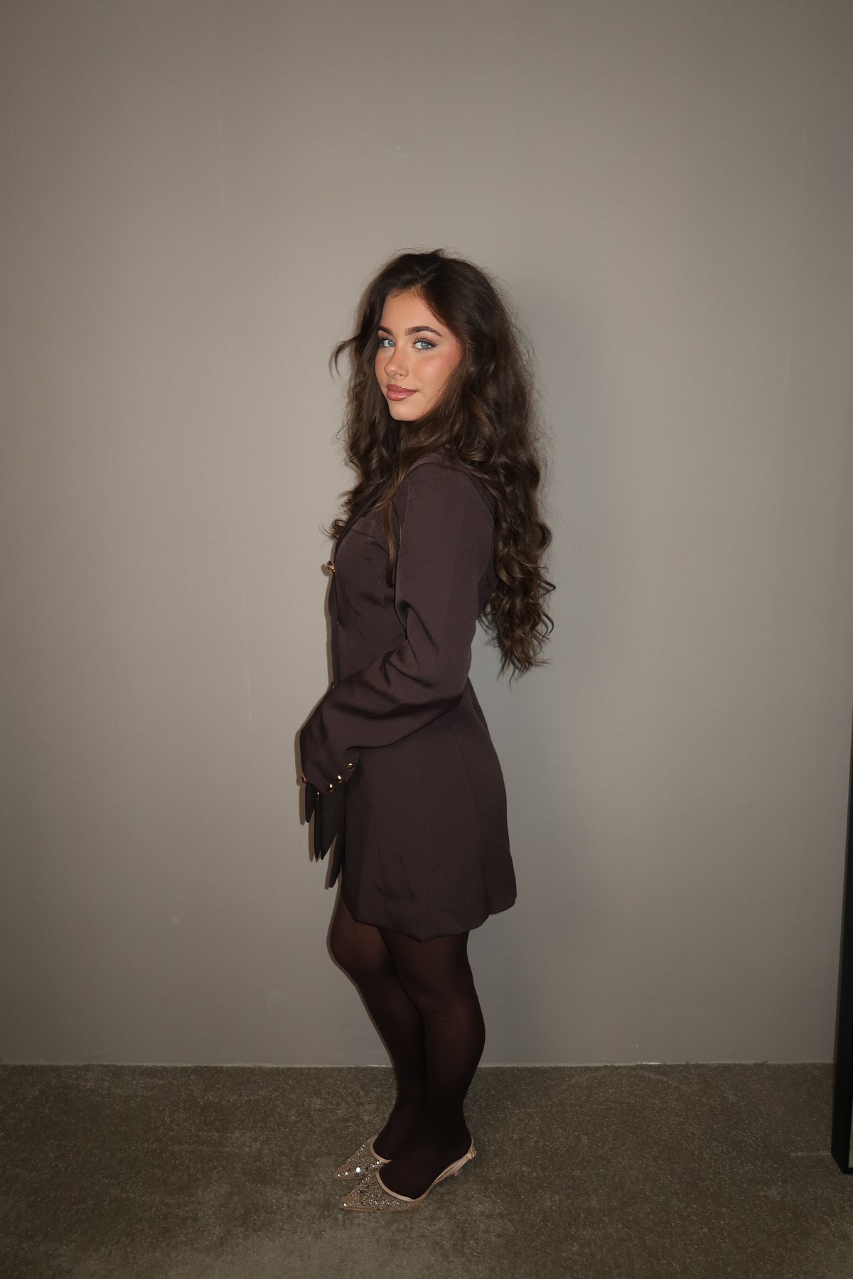 Dark Brown Chique Blazerdress met gouden knopen en getailleerde pasvorm.