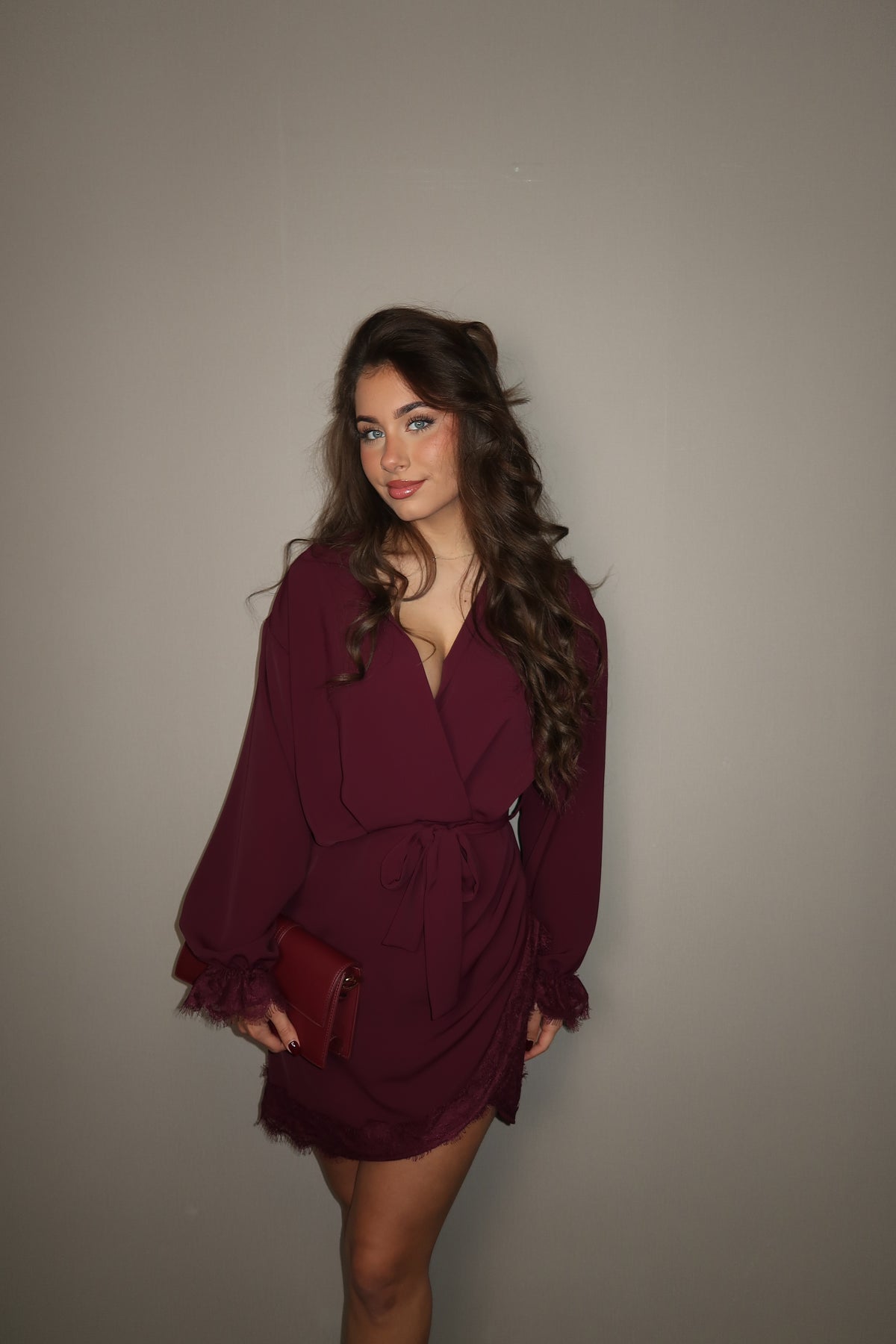 Overslagjurkje met kanten Details Bordeaux en elastieke tailleband