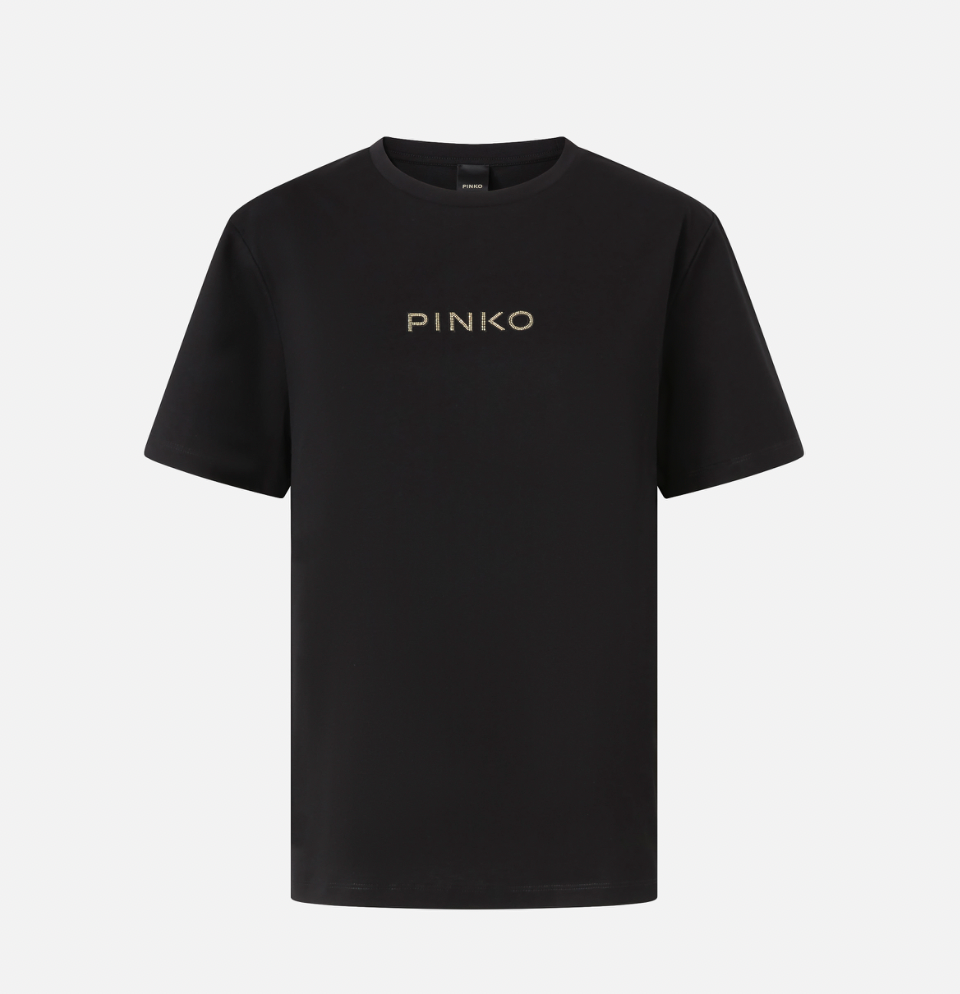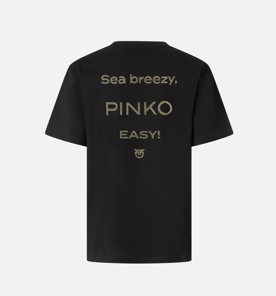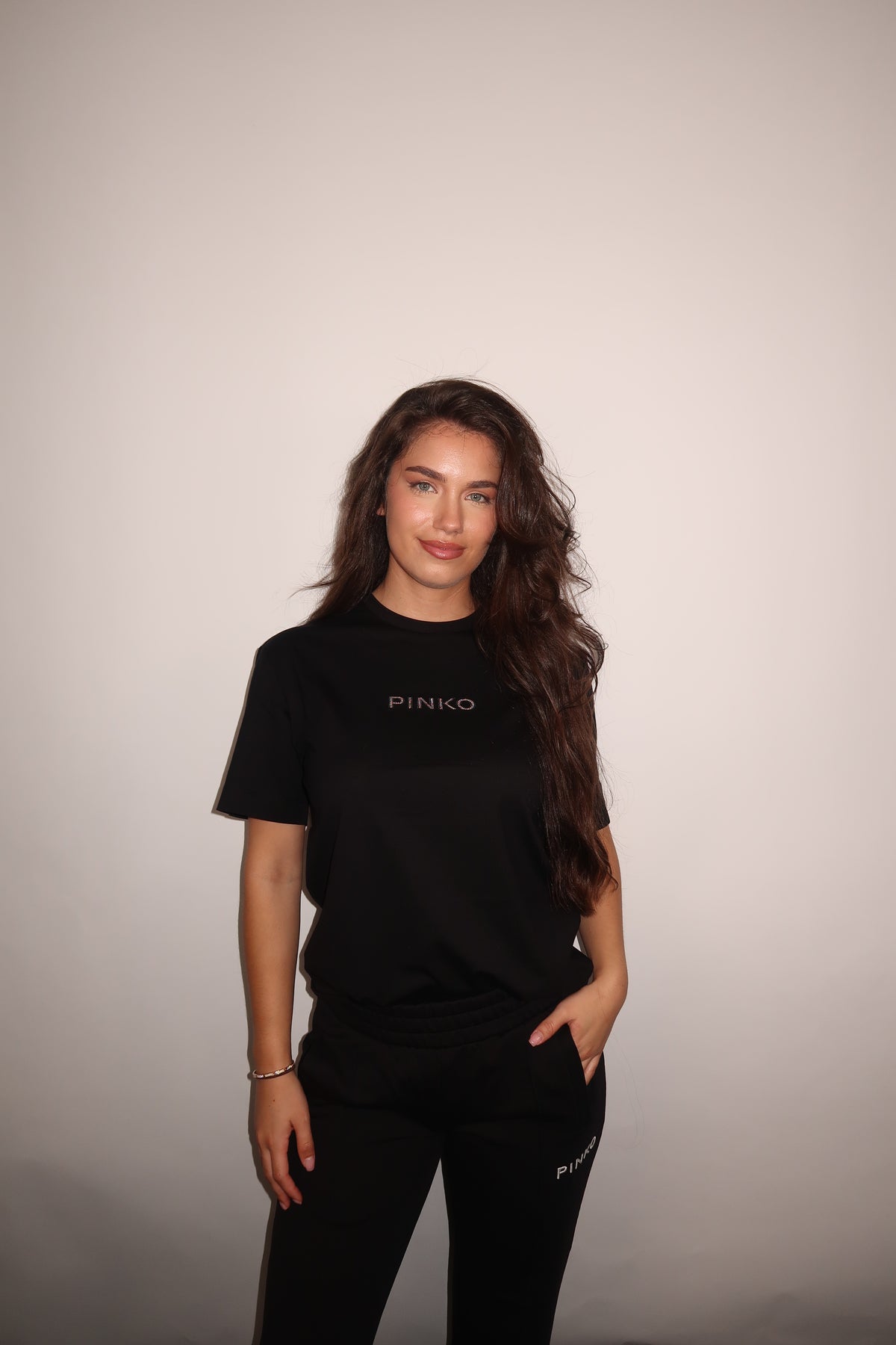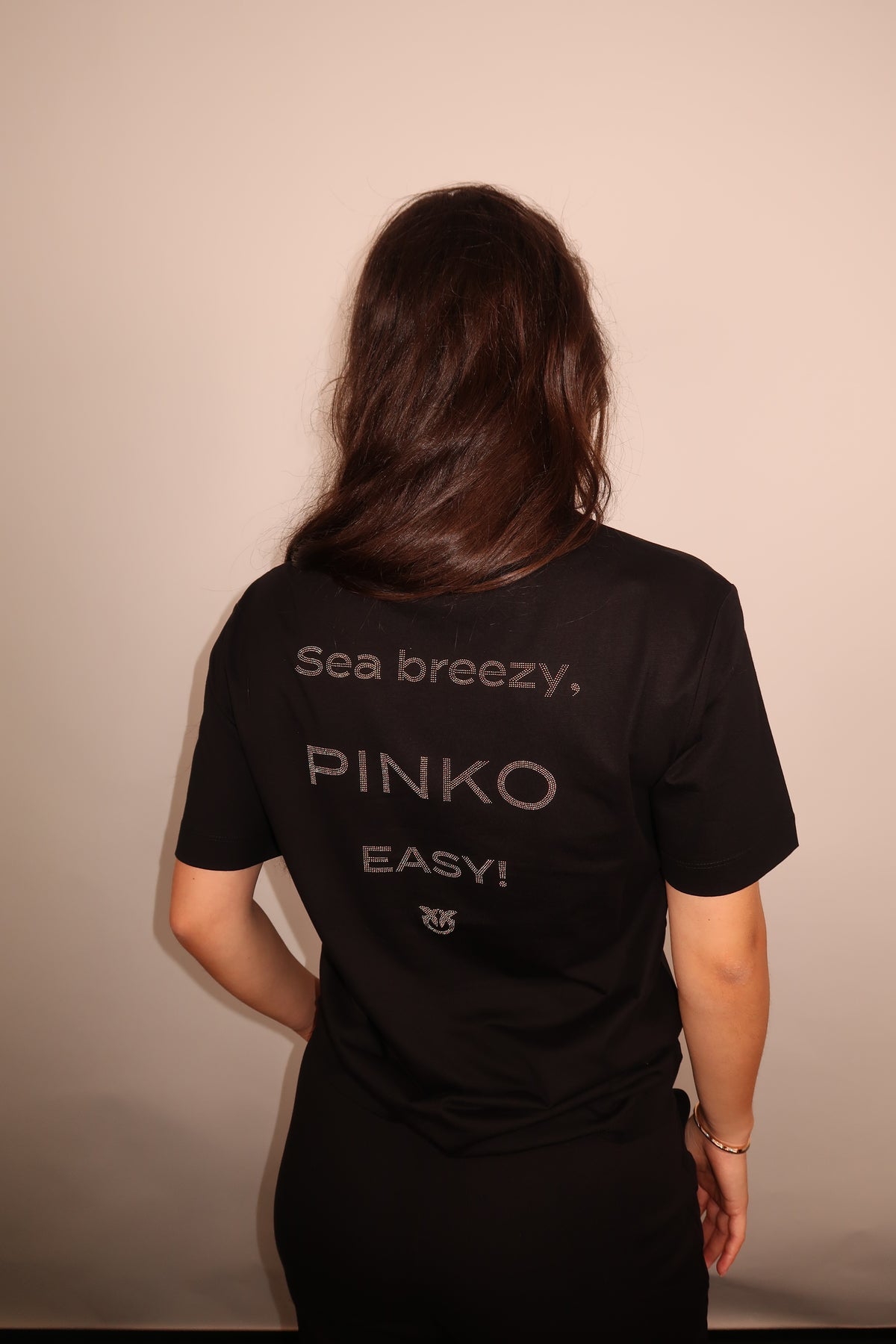 Pinko Strepitoso T-Shirt Strass Black met tekst in Steentjes.