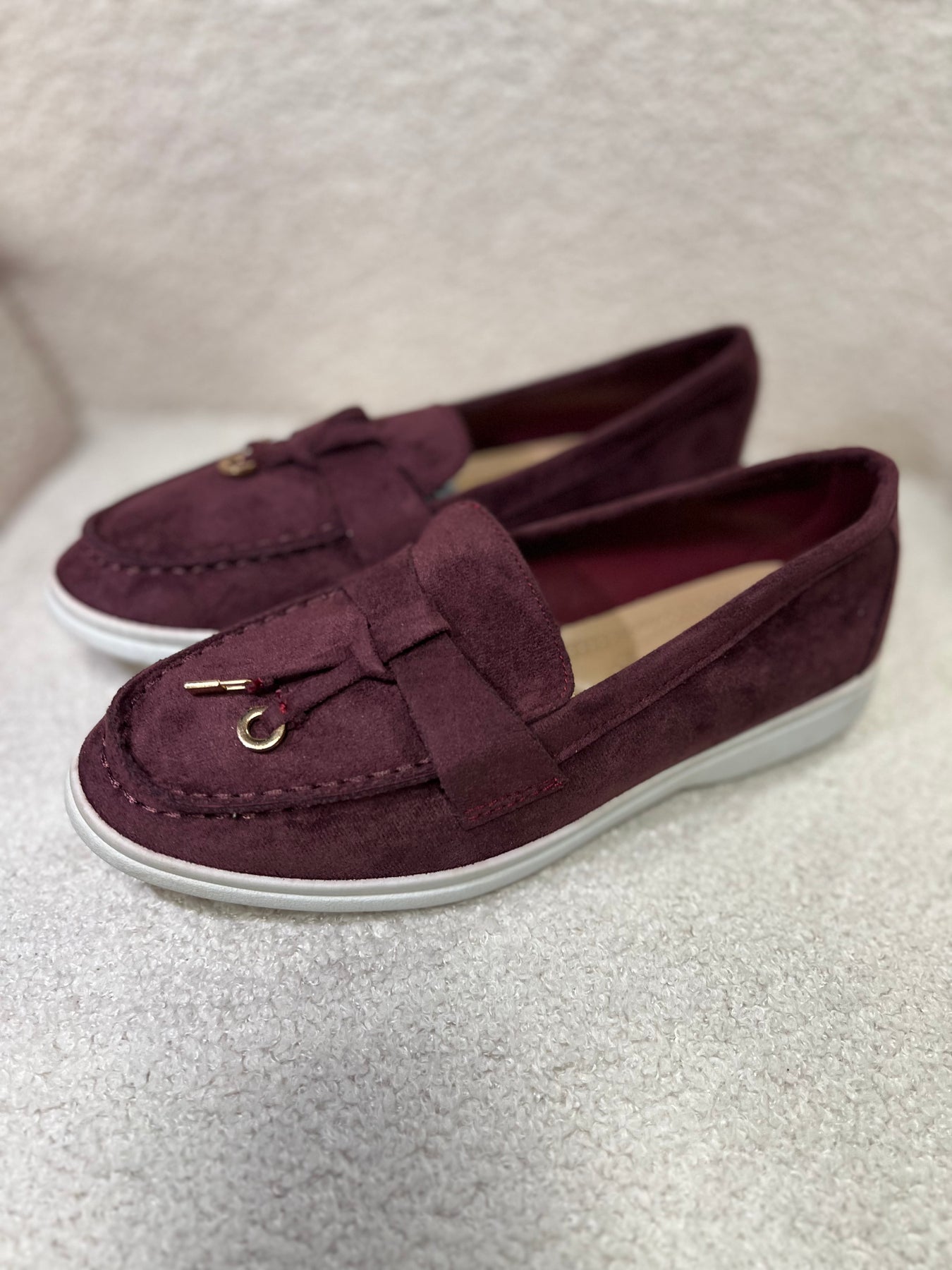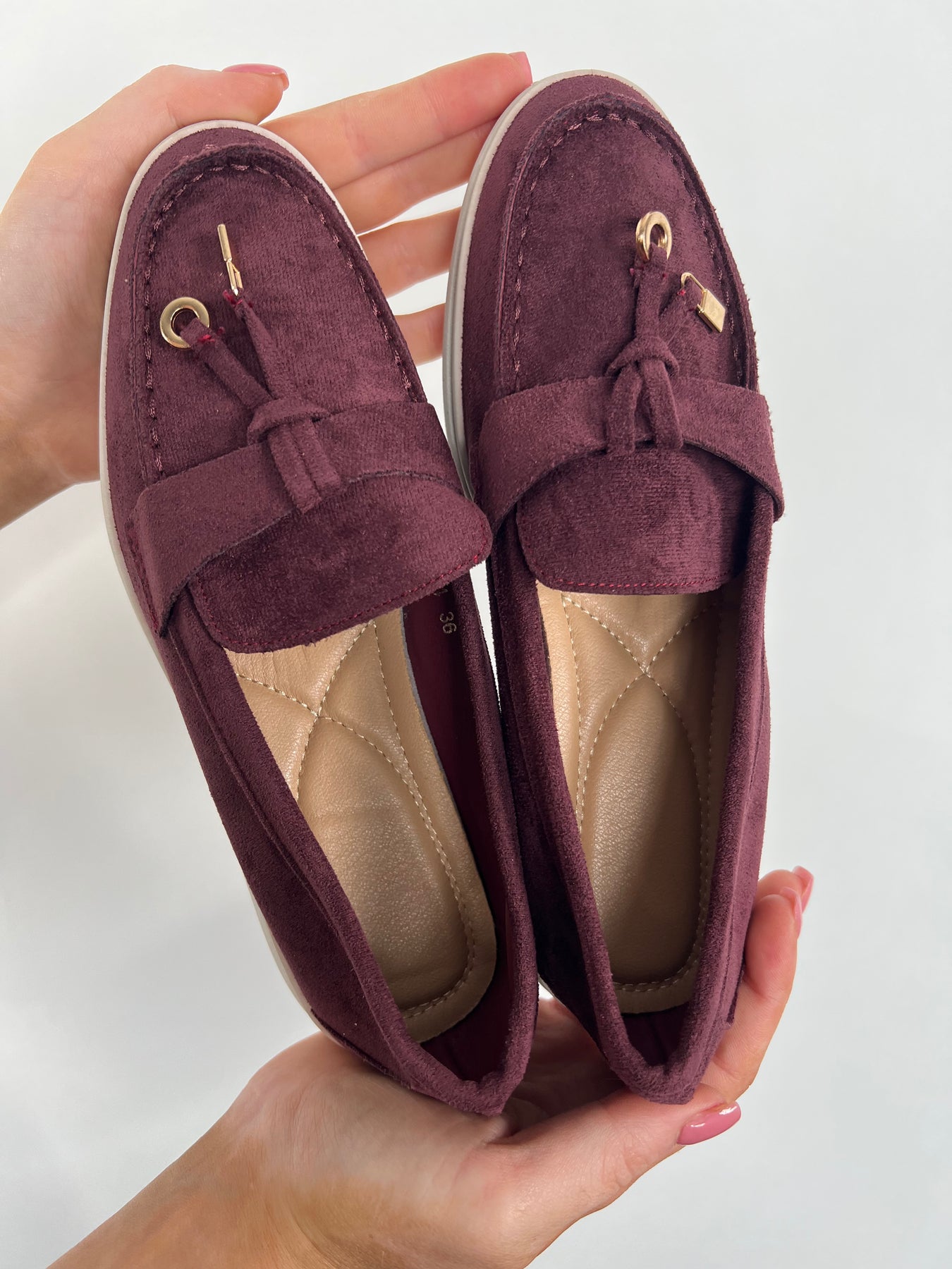 Must Have Loafers Bordeaux met gouden details en witte zool.
