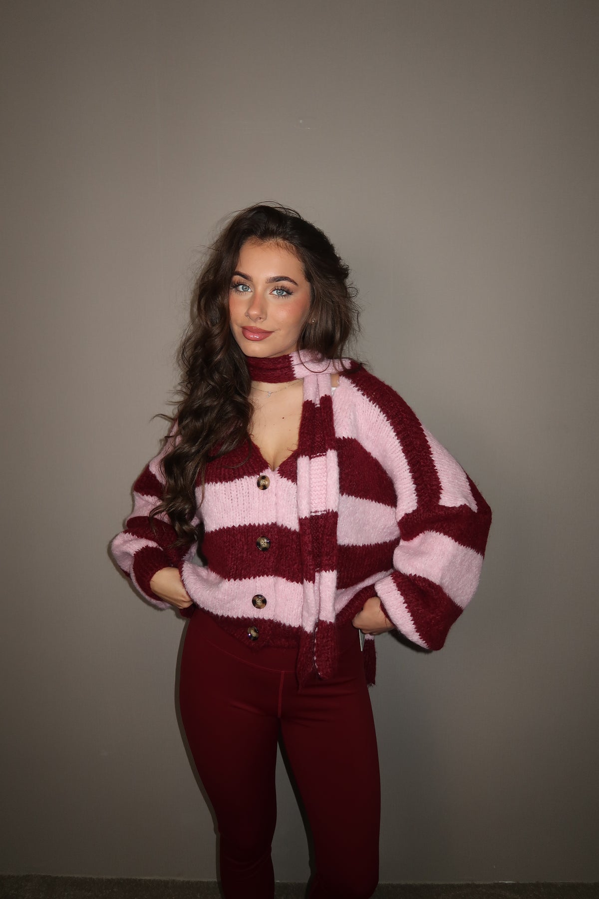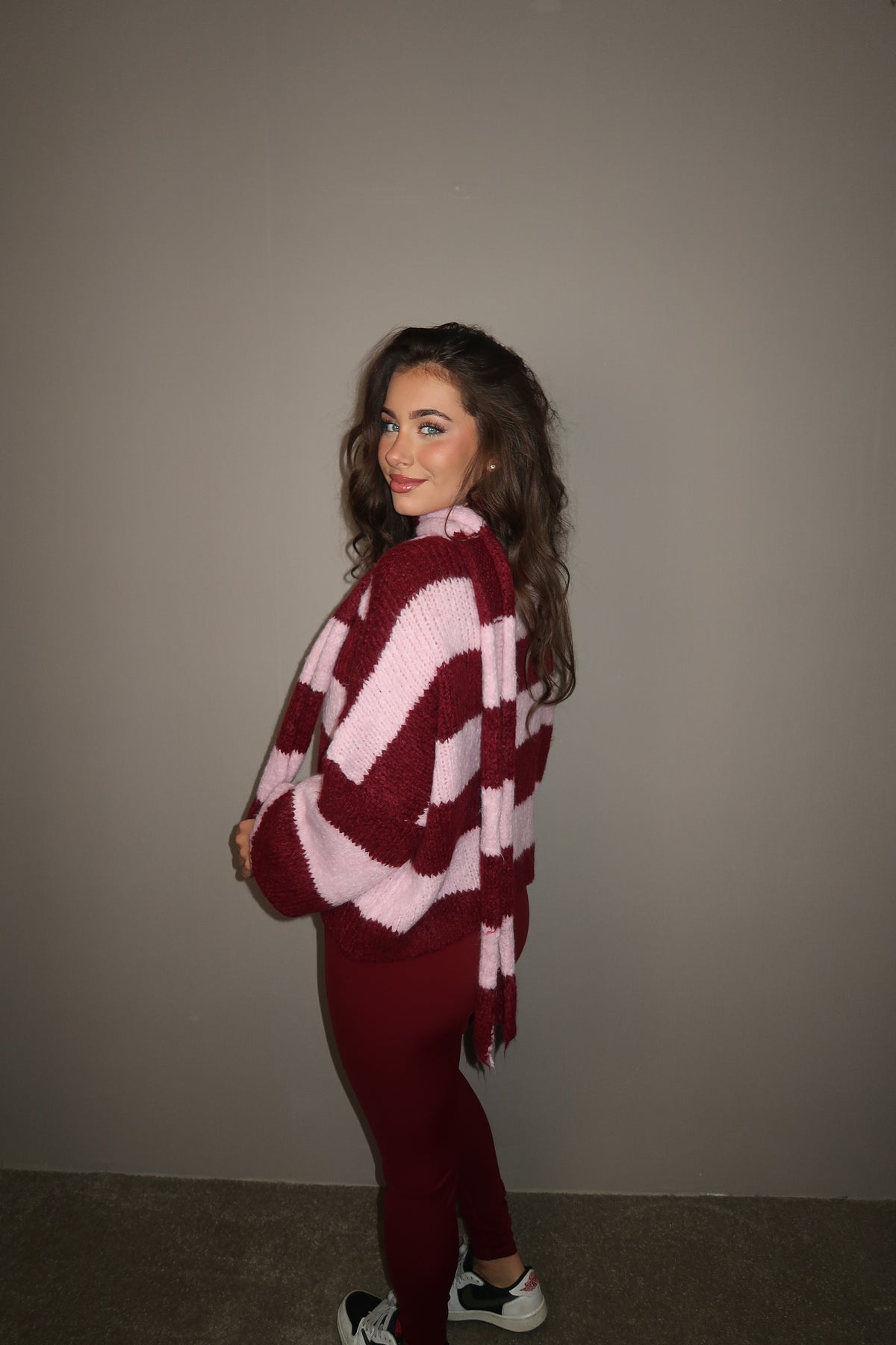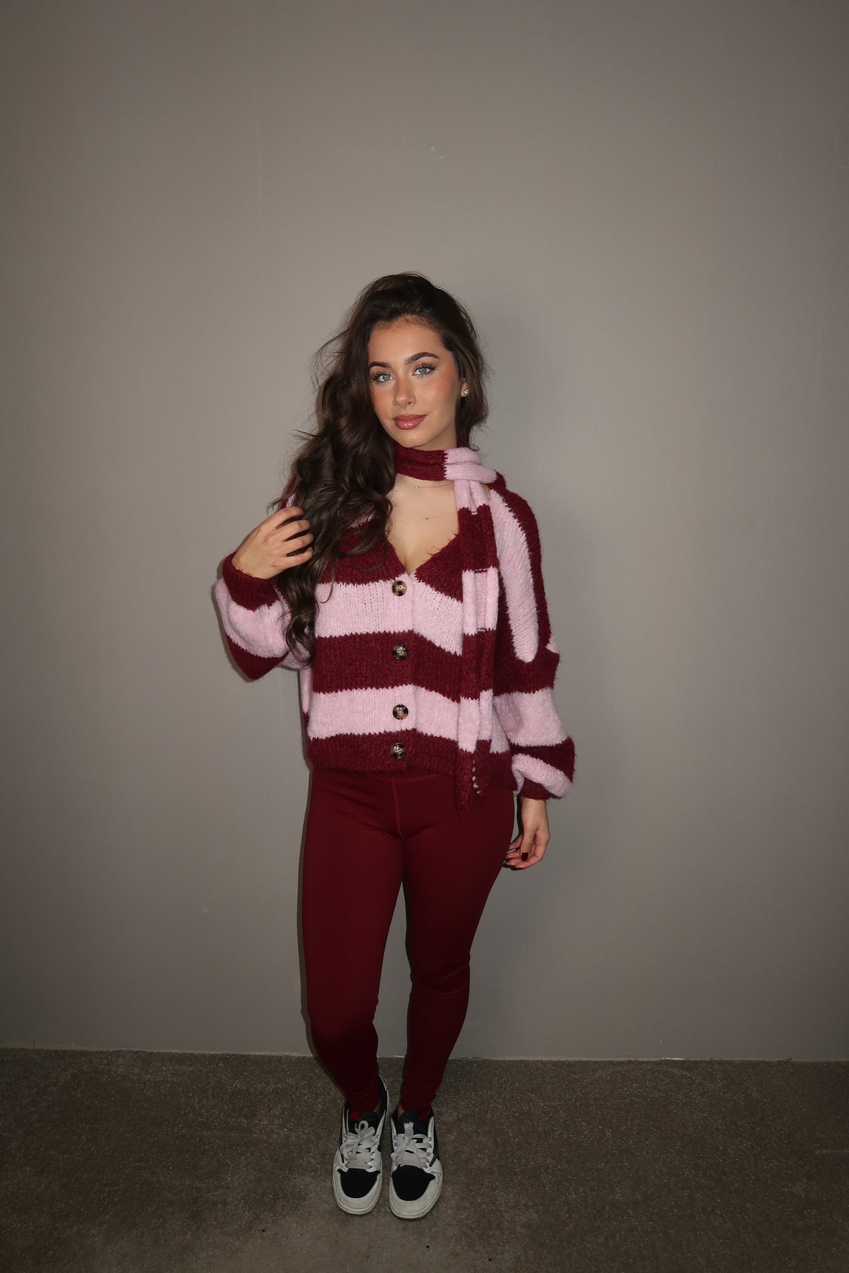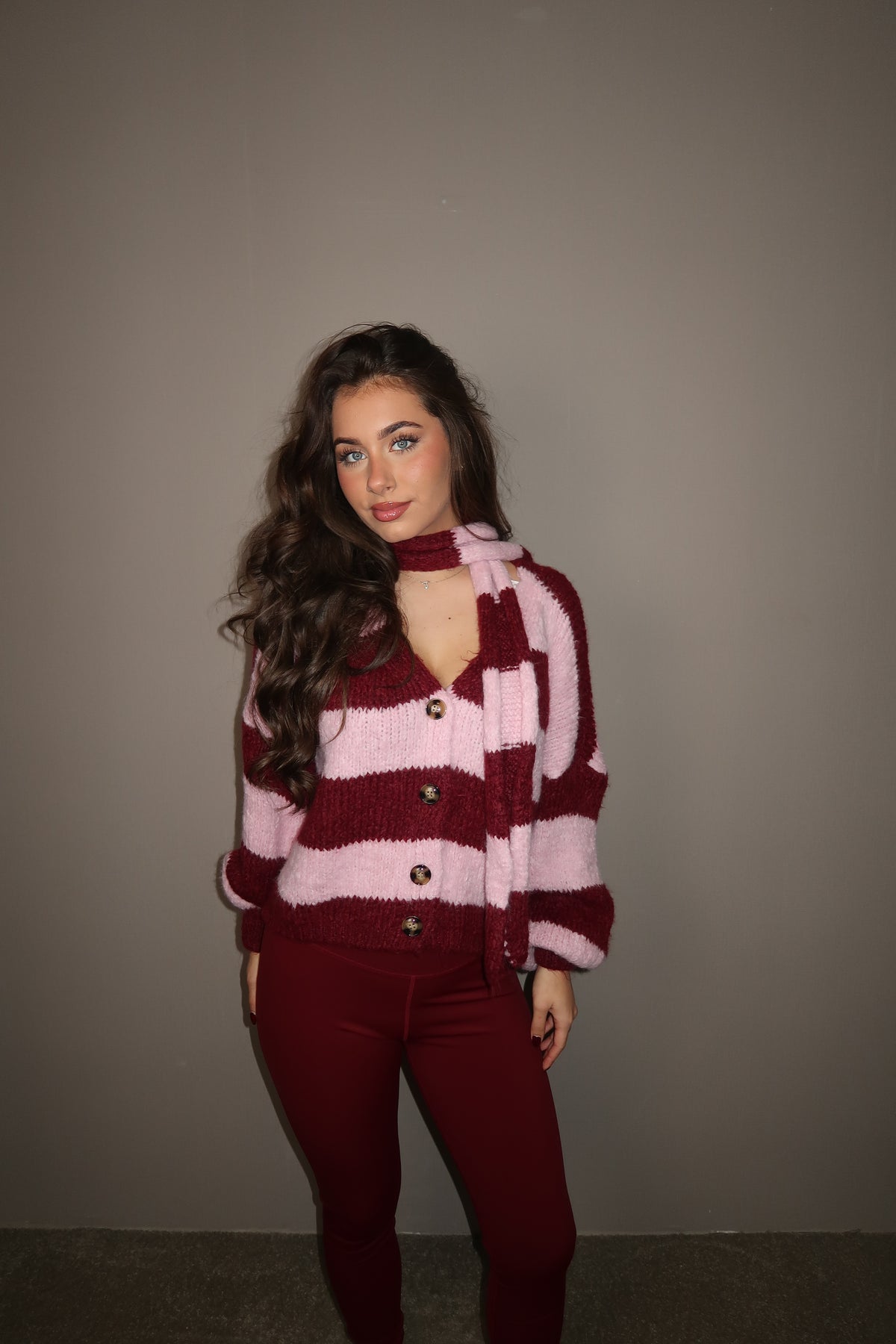 Gestreept Roze/Bordeaux Vest met Sjaal in zacht breisel, kriebelt niet.