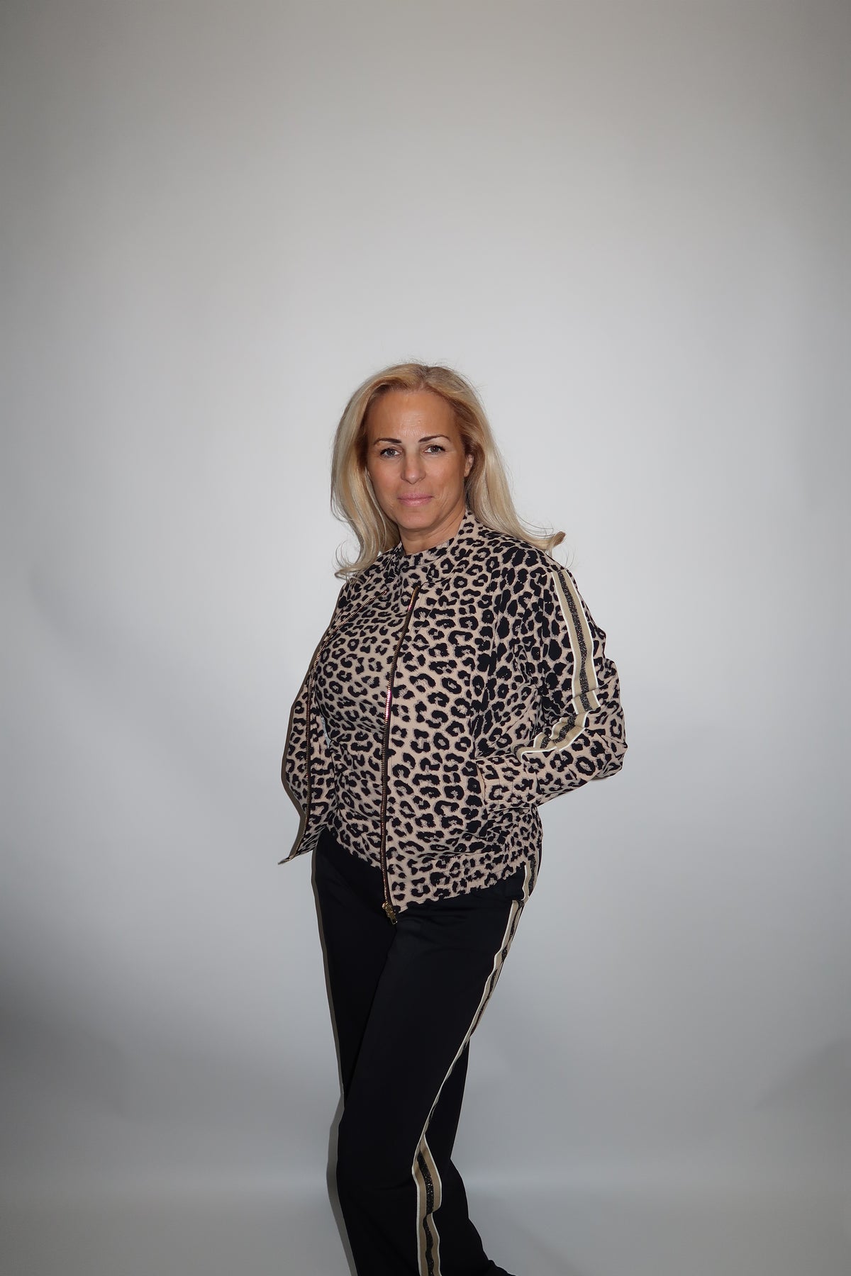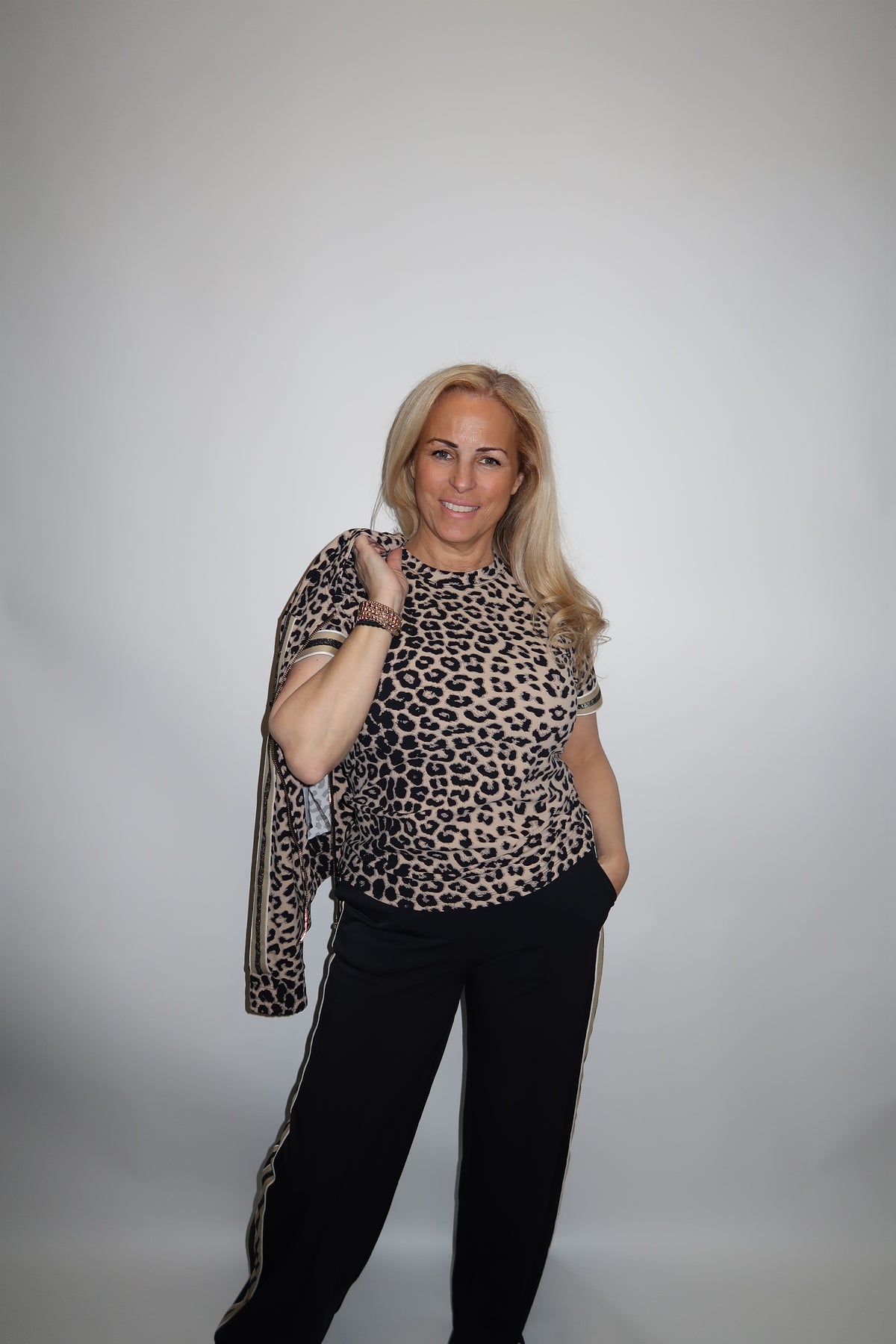 Ambika leopard Travel Tee met goudkleurige bies aan de mouwen.