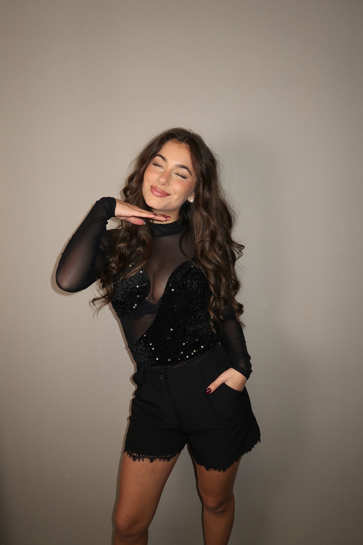 Zwarte Glitter Cut-Out Body met Mesh en pailletten. Zachte Mesh stof met lovertjes.