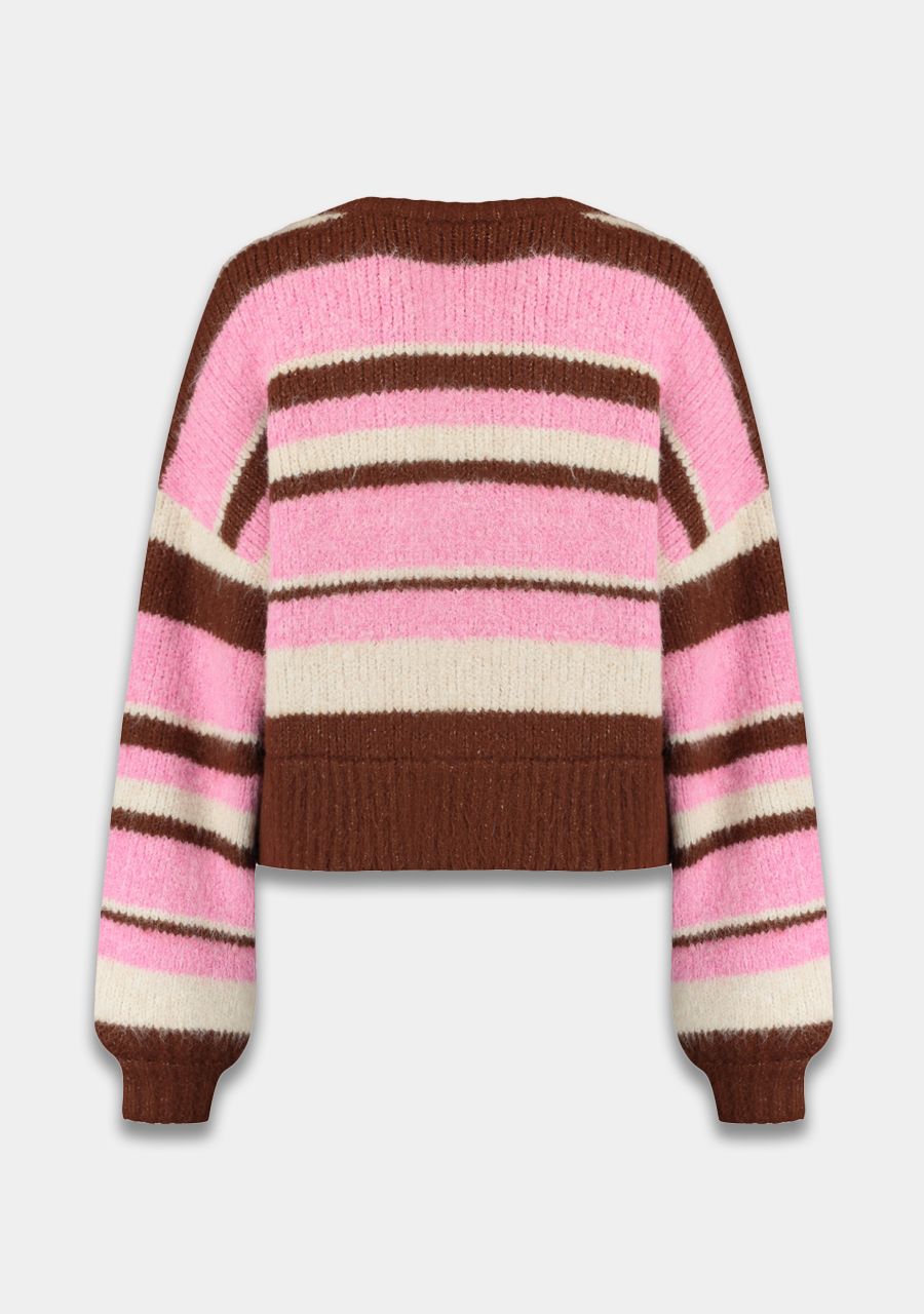 Colourful stripes, endless comfort. Deze NOOR cardigan met multistrepen heeeft een open fit, zachte feel en verlaagde schouder voor een relaxte vibe. Perfect als statement boven basics of als cosy laag bij koudere dagen. Warm, bold and made to stand out.